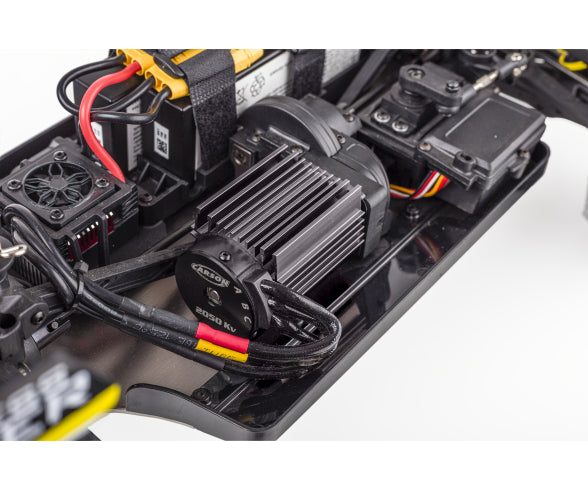 Extra starke Buggy Power: Mit dem Carson Akuma Buggy ist kein Gelände mehr sicher! Der superstarke 100 A Brushless 4S mit 2050 Kv Motor, einstellbare Öldruckstoßdämpfer, sowie die äußerst griffigen High-Grip-Offroad Reifen treiben das Fahrzeug sicher und effektiv über jedes Terrain. Der Buggy ist ready to run und ausgestattet mit 1x 2,4 GHz Fernsteueranlage, 2x LiPo Fahrakku (7,4 V/3800 mAh), 1x Ladegerät, 4x Senderbatterien LR06 / AA, sowie einer ausführlichen Anleitung. Vollgeladen und unter voller Auslastung sind 10 Minuten Fahrzeit möglich. Die präzise gefrässte 3mm Alu Chassi Platte, der XT90-Akku-Steckeranschluss und ein starker und wasserfester 20 kg Lenkservo mit Metallgetriebe werten den Boliden auf und machen ihn nicht nur für Fortgeschrittene, sondern auch für Profis im RC-Bereich attraktiv. Unter idealen Bedingungen sind Höchstgeschwindigkeiten von bis zu 70 km/h mit dem Gefährt drin.