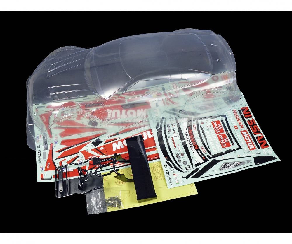 This is a clear polycarbonate body of the Motul Autech Nissan GT-R. The body comes complete with vinyl stickers to complete the window trim, headlights, tail lights and race team livery markings. A handy window masking seal is also included for easy masking of the windows when painting your body.