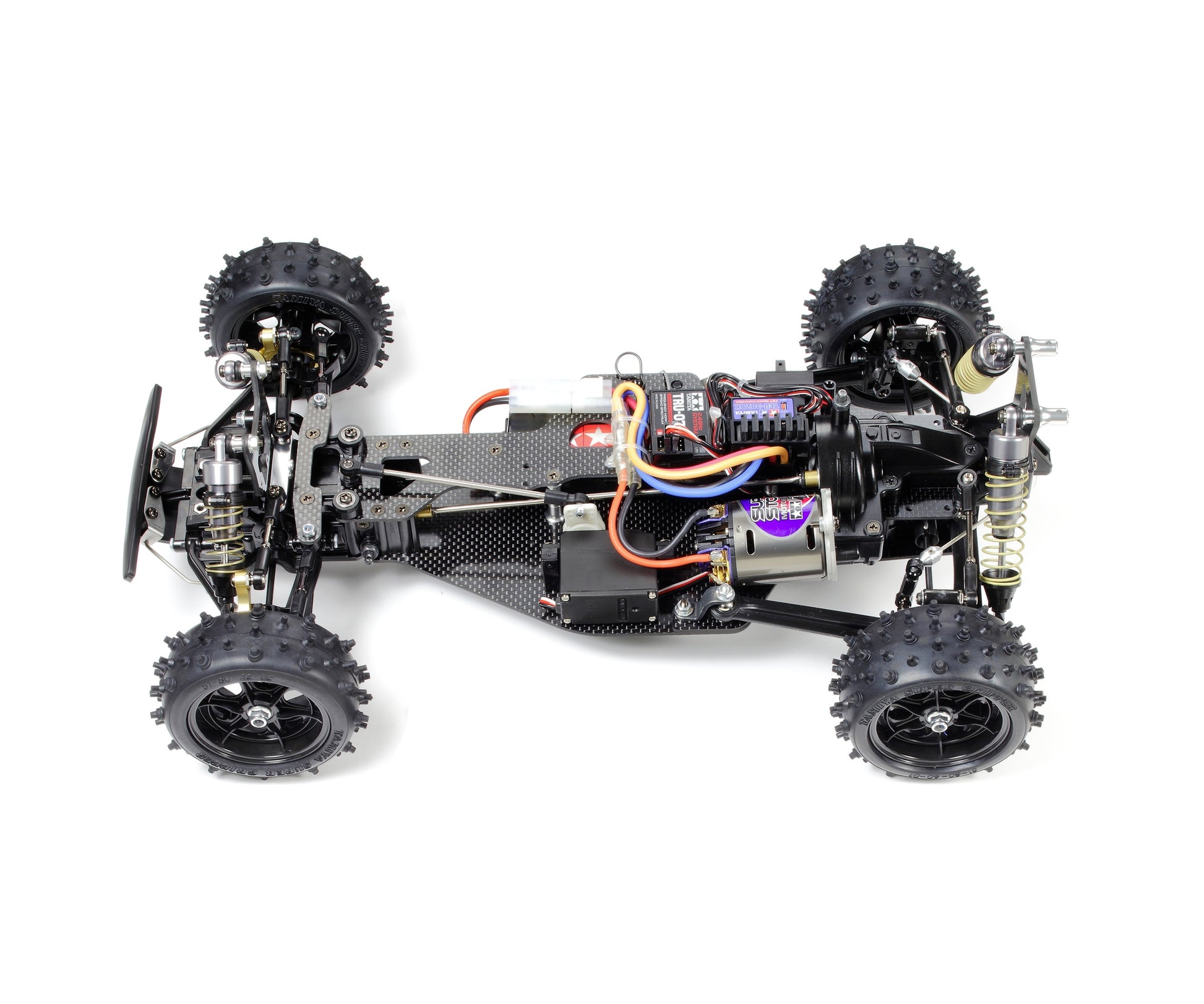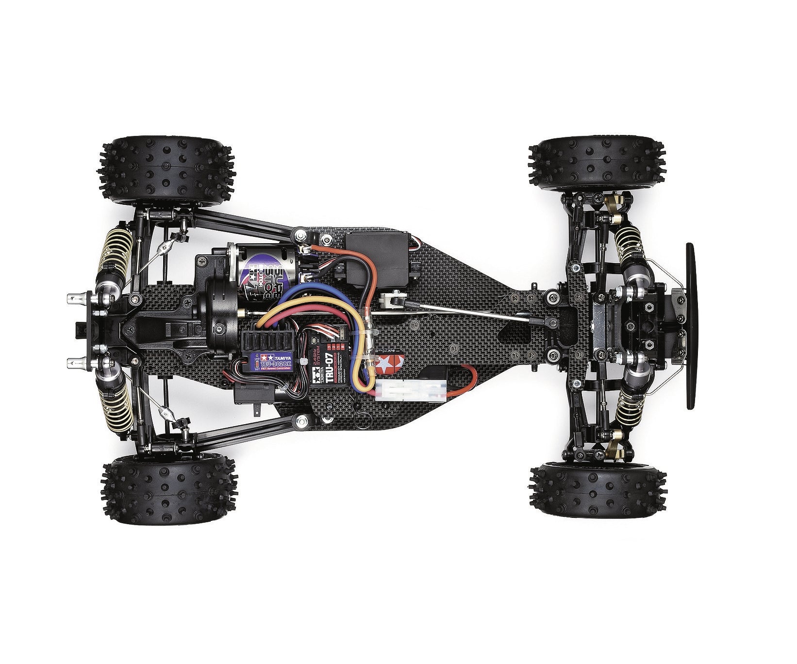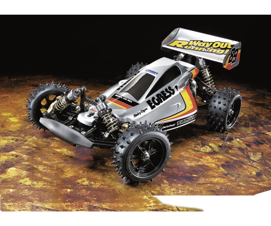 Der TAMIYA Egress 2013 ist eine moderne Variante des erstmals 1989 der RC-Szene vorgestellten Highend Rennbuggys. Als Basis diente der bekannte Avante, jedoch wurde dieser mit speziellen Tuningteilen aufgerüstet. Zahlreiche Karbon- und Aluminiumteile sorgen für ein absolut leichtes und stabiles Chassis, das ohne weiteres mit modernen Wettbewerbsbuggys mithalten kann. Neue Kugeldifferenziale und Mitnehmer verteilen die Motorkraft mit noch geringeren Verlusten an die griffigen Spikereifen. Ein zentraler Freilauf erhält beim Bremsen die Lenkfähigkeit, da die vorderen Räder frei rollen können. Der lange Radstand und große Öldruckstoßdämpfer verleihen dem 4WD-Buggy Spurtreue und Haftung im Gelände und mit optionalen Tuningteilen kann der Egress 2013 noch weiter getunt werden.