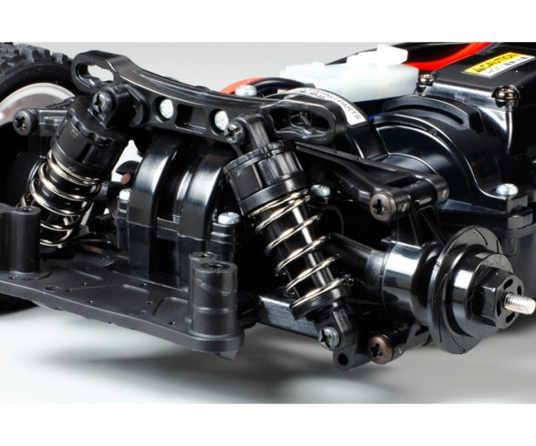 Der TAMIYA Lancia Delta HF Integrale auf dem TT-02 Chassis ist ein leicht aufzubauendes RC-Modell mit Allradantrieb. Der 4WD-Antrieb macht die rund 41 cm lange Rallyelegende, auch als Miniatur, zum Spaßbringer. Als Basis dient dem Bausatzmodell im Maßstab 1:10 das TT-02 Chassis. Bei diesem sind Radstand, Bodenfreiheit, Spur und Getriebeübersetzung vielfach einstellbar und mit den unzähligen optionalen Tuningteilen lässt sich das Chassis schnell zum Racer tunen oder für den Off-Roadeinsatz umrüsten. Der 4WD-Antrieb mit zentraler Welle, doppelte Querlenker und Federbeine an allen vier Rädern sorgen für ein vorbildgetreues Fahrbild und beste Traktion. Die Chassisunterseite ist extra glatt gestaltet und das Batteriefach nimmt alle gängigen Akkutypen auf. Optisches Highlight sind die Radmitnehmer, die angesetzte Bremsscheibenattrappen haben. Die robuste Polykarbonatkarosserie gibt die dynamische Form des Lancia Delta HF Integrale perfekt wieder und sorgt zusammen mit dem Allradantrieb für Rennaction.
