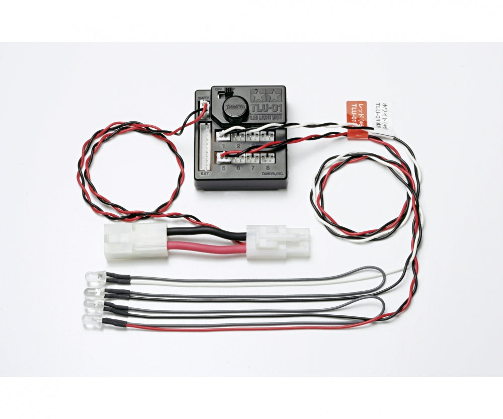 Die TAMYIA TLU-01 N° 300053909 ist serienmäßig mit zwei hellen LED Paaren für vorne und hinten sowie Montagematerial ausgestattet. An die Lichteinheit können bis zu 8 LED Paare angeschlossen werden. Diese werden in den drei Farben Weiß, Rot und Orange (N° 300053910, 300053911, 300053912) angeboten. Somit lassen sich zusätzliche Scheinwerfer, Bremslichter oder Blinker simulieren. Mit der Steuereinheit TLU-02 N° 300053937 lassen sich zwei TLU-01 Einheiten ansteuern und zahlreiche Lichteffekte wie die eines "Pace Cars" erzeugen.