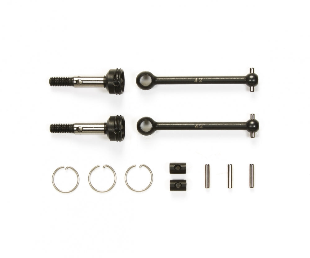 These are universal drive shafts designed for the front of the Tamiya XV-01 cross platform chassis. Once installed you can enjoy the threefold benefits of employing universal shafts on your model; enhanced drivetrain efficiency; increased ability to hug the road surface; and reduced tendency of dog-bone type drive shafts to dislodge on impact.